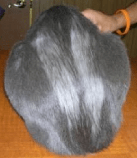 Here is an interesting case that displayed this behavior, but not for orthopedic pain! A client brought her 10-year old cat to see me because her beloved cat had started to lick fur excessively over the lumbar spine. No other signs were noted at home. I recommended a full workup with blood work to evaluate how this cat was working internally. Low and behold, this cat was in kidney failure! We know that kidney failure can be painful, and this cat’s observant owner picked up on this odd behavior just in time for an aggressive therapeutic plan to be commenced. Below is a picture displaying a similar pattern of hair loss from this feline patient.
